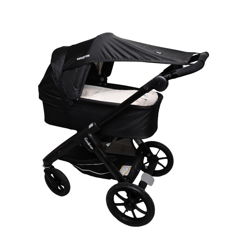 En super praktisk solskjerm for barnevogn. Du fester den over kalesjen med et elastisk bånd under ryggen/baggen. Solskjermen ligger inne i en lang lomme med glidelås. Når solen kommer frem åpner du enkelt lommen og drar ut solskjermen. Den har stropper i hvert hjørne som knytes til håndtaket. Solskjermen dekker mye og gir godt med skygge, samtidig som den slipper inn masse luft fra sidene slik at det ikke blir varmt i vognen. Du kan også skyve skjermen oppover stroppene slik at du kan se barnet. Easygrow solskjerm er universal og passer på alle vogner, både med bag og sittedel hvor barnet er vendt mot deg og håndtaket. Den beskytter godt mot solen med UPF 50+ mot både UVA og UVB stråle