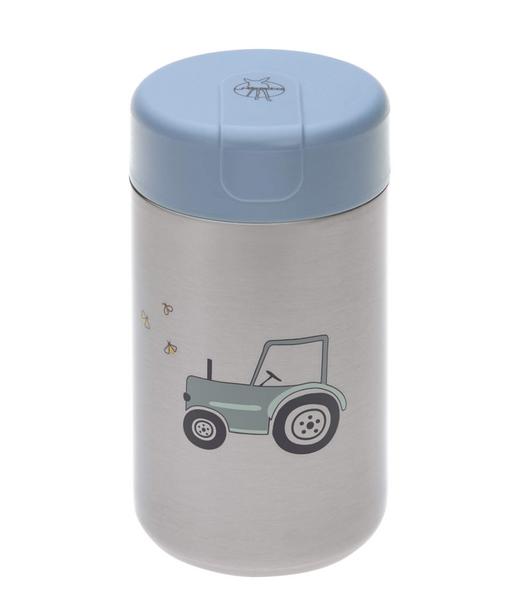 Matkrukke i rustfritt stål med blå traktor holder babymaten klar til å spise når du er ute og reiser. Den rustfrie stålkolben rommer 480 ml og holder maten varm eller kald, er lekkasjesikker og lett å fylle.
