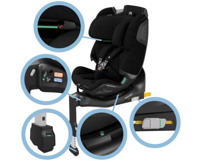 Setet er utstyrt med SlideTech®-teknologi som gjør det mulig å skyve setet 17 cm ut mot deg før rotasjon. Det har 360° rotasjon i alle liggestillinger, fast “easy-in”-sele og fem hvile- og sittestillinger. Nyfødtinnlegg i ClimaFlow-materiale gir støtte for barn fra 40 til 75 cm. Trekket er avtakbart og kan vaskes.