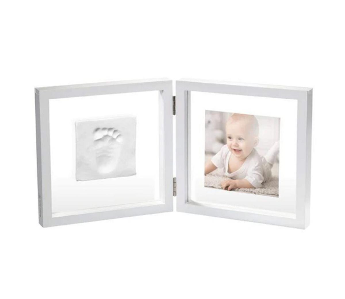 Denne moderne hvite bilderammen av tre inneholder alt du trenger for å lage et personlig minnesmerke med babyens små avtrykk.