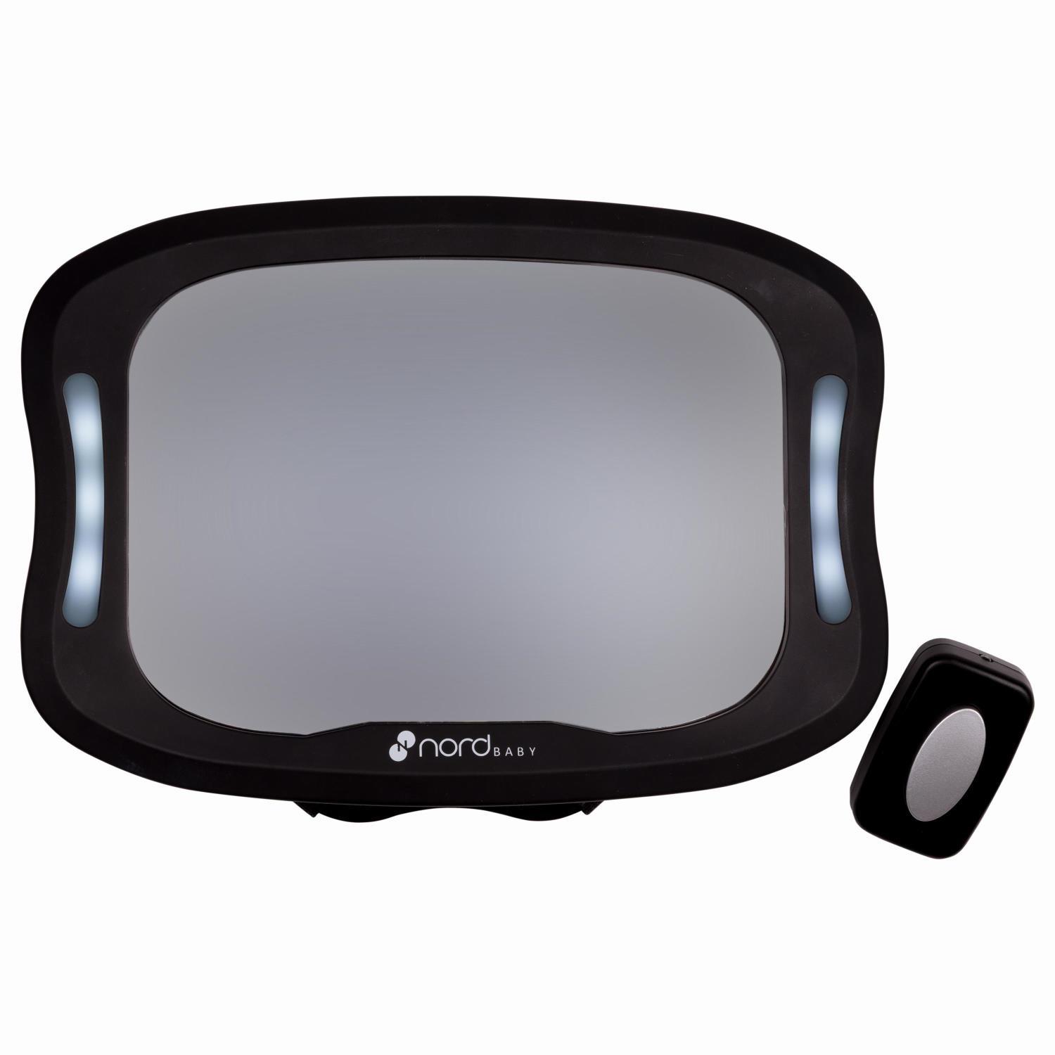 Innebygd LED-bakbelysning i speilet gjør at du kan se babyen godt til enhver tid. Fjernkontrollen, som følger med, lar deg slå lysene av og på fra førersetet.